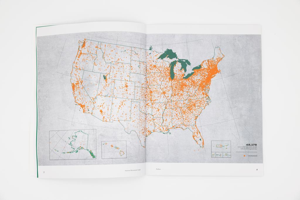 The National Monument Audit (2021), produced by Monument Lab in partnership with The Mellon Foundation, assesses the monument landscape across the United States. Monument Lab’s research team spent a year scouring almost a half million historic records created and maintained by federal, state, local, tribal, institutional, and publicly assembled sources. For our deepest investigations, we focused on a study set of approximately 50,000 conventional monuments representing data collected from every US state and territory.